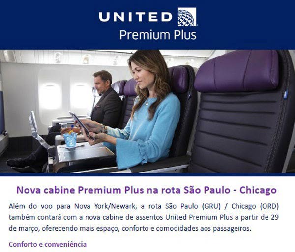 Além do voo para Nova York/Newsark, a rota da United no trecho São Paulo (GR) / Chicago (ORD) também contará com a nova cabine de assentos United Premium Plus a partir de 29 de março de 2020. A nova cabine United Premium Plus oferece mais espaço, conforto e comodidade aos passageiros.